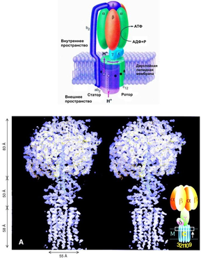 АТФаза состоит из двух отдельных частей: (1) F0, гидрофобной части, связанной с мембраной, ответственной за транспорт протонов, и (2) F1, гидрофильной части, ответственной за синтез и гидролиз АТФ (см. рис.1).