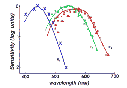 Красные и зелёные колбочки отличаются друг от друга очень мало. На уровне -3дБ "красные" колбочки отличаются от "зелёных" на 10-20 нм, а от "синих" на 100 нм.