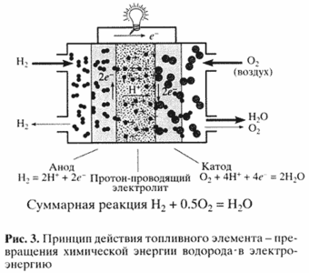 В простейшем топливном элементе, где используются чистый водород и чистый кислород, на аноде происходит разложение водорода и его ионизация (рис. 3). Из молекулы водорода образуются два иона водорода и два электрона. На катоде водород соединяется с кислородом и возникает вода. Фактически в этом и состоит главный экологический выигрыш: в атмосферу выбрасывается водяной пар вместо огромного количества углекислого газа, образующегося при работе традиционных тепловых электростанций.