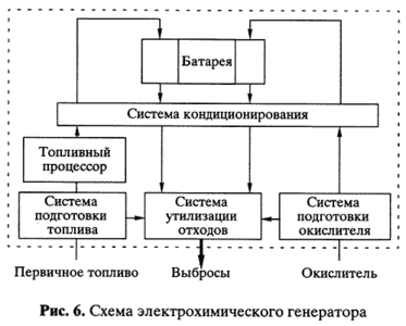 Топливный элемент - лишь составная часть электрохимического генератора, который содержит еще системы кондиционирования, подготовки топлива, утилизации отходов и др. (рис. 6). Первичным топливом могут быть метан, пары метанола, керосина, синтез-газ и т.д. Коэффициенты полезного действия у генераторов с топливными элементами (рис. 7) изменяются от 30% (двигатели внутреннего сгорания и газовые турбины) до 60-65% (энергоустановки с твердооксидными топливными элементами).