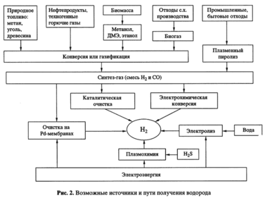 Начну с производства водорода. Один из его источников - природное топливо: метан, уголь, древесина и т.д. При взаимодействии топлива с парами воды или воздухом образуется синтез-газ - смесь СО и Н2 (рис. 2). Из нее затем выделяется водород. Другой источник - отходы сельскохозяйственного производства, из которых получают биогаз, а затем - синтез-газ. Промышленно-бытовые отходы тоже используются для производства синтез-газа, что способствует одновременно и решению экологических проблем, поскольку отходов много и их нужно утилизировать. В конечном счете образуются углекислый газ, водород и окись углерода. Дальше идет каталитическая очистка, электрохимическая конверсия и т.д. Водород можно получать также электролизом воды, то есть разложением ее под воздействием электрического тока. Очень важным элементом при преобразовании газа, содержащего водород, является очистка газа на палладиевых мембранах. В конечном счете получается чистый водород.