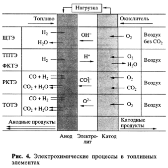 Я приводил пример топливного элемента, в электролите которого перенос заряда осуществляется ионами водорода (см. рис. 3). В других топливных элементах носителями заряда могут выступать ион кислорода, радикал ОН- или СО3- окислителями могут быть кислород либо воздух (рис. 4).