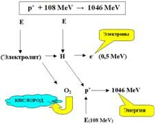 Цепную реакцию индуцированного распада протонов можно реализовать в водородсодержащей среде. Идеальной средой для этой цели является вода. На рис. 7 приведена схема энергопреобразований в способе получения энергии при индуцированном распаде протонов. В качестве остаточного вещества будет выделяться кислород.