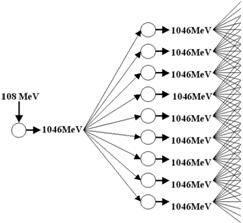 Как отмечалось выше, доля энергии, обеспечивающая устойчивость протона, составляет величину около 11,5 % от его энергии покоя. Расчеты показывают, что энергии одного протона достаточно для того, чтобы при распаде инициировать распад еще 8 протонов. При соответствующих условиях возможна цепная реакция индуцированного распада протонов, которая может поддерживаться и развиваться за счет деструктуризации вещества. При этом будет происходить генерация зарядово-сопряженных частиц, имеющих массу меньше, чем у протона. Необходимым условием, при котором возникает цепная реакция распада протонов, является получение ими дополнительной энергии не менее 107,74 МэВ на один протон. Все промежуточные зарядово-сопряженные частицы неустойчивы. При достаточном количестве зарядово-сопряженных пар суммарная энергия их рекомбинации может превысить энергию 107,74 МэВ, что является достаточным для инициирования распада другого протона. При этом возможна самоподдерживающаяся цепная реакция индуцированного распада протонов. На рис. 6 приведена схема цепной реакции индуцированного распада протонов.