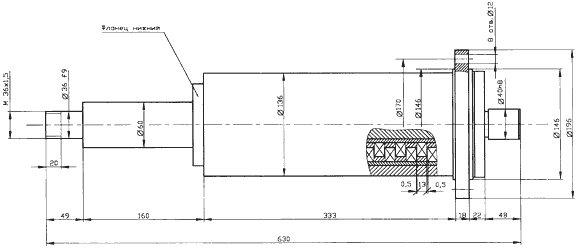 На чертеже (рис.3) приведен общий вид конструкции с габаритными и присоединительными размерами. На фото рис.4 представлен общий вид описанной магнитной опоры на стенде. В нижней части устройства видно жидкостное уплотнение диаметром 60 и длиной 160мм для возможности создания вакуума в корпусе, где будет вращаться подвешиваемая деталь. Это делается для минимизации потерь на вращение деталей с высокой угловой скоростью, например, маховиков накопителей энергии.