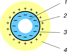 Рис. 3. Устройство шаровой молнии: 1 – область низкого давления, занятая электронами; 2 – область, где происходит ионизация молекул воздуха электронами; 3 – область высокого давления (около 100000 атм.), в которой происходит рекомбинация положительно и отрицательно заряженных ионов и образуется экранирующий слой плазмы (радиус Дебая) и изоляции из нейтральных молекул воздуха; 4 – окружающее пространство, насыщенное положительно заряженными ионами.
