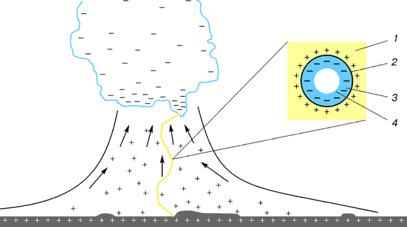 Рис. 2. Формирование ствола молнии: 1 – пространство насыщенное положительно заряженными ионами; 2 – область высокого давления; 3 – область, где происходит ионизация молекул воздуха электронами; 4 – область низкого давления занятая электронами.
