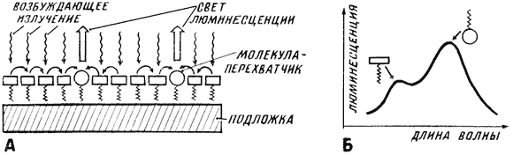 Рис. 9. В смешанном монослое имеются молекулы, поглощающие свет (хвостатые прямоугольники), и молекулы-перехватчики (хвостатые кружки), отнимающие энергию от поглотителей. Интенсивность люминесценции монослоя при его освещении примерно одинакова для поглотителей и перехватчиков, хотя перехватчиков гораздо меньше и сами они почти не поглощают свет.