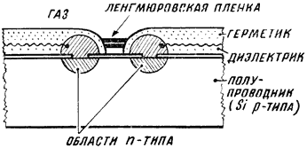 Широкое развитие получают сейчас гибридные системы, где ленгмюровские пленки скомбинированы с традиционными транзисторными элементами. Высокая диэлектрическая прочность позволяет использовать такие пленки в качестве одного из элементов – так называемого подзатворного диэлектрика в полевых транзисторах. Все это расширяет диапазон используемых полупроводниковых кристаллов. Диэлектрические монослои улучшают характеристики солнечных батарей и светоизлучающих (люминесцентных) диодов, «очувствляют» поверхность фотоматериалов и т.д. Примером гибридной структуры может служить «искусственный нос» (рис.13), где ленгмюровская пленка играет роль избирательного фильтра, пропуская к поверхности транзистора только молекулы, скажем, водорода или азота и ничего больше. Для другого газа нужно, разумеется, брать пленку из другого материала, и таким образом можно создать набор химических сенсоров – чувствительных датчиков.