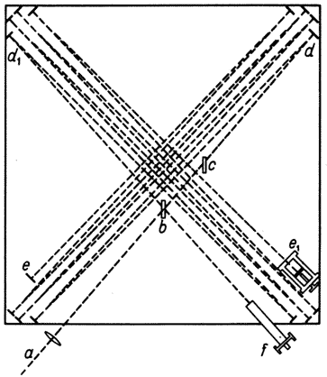 В каждом углу камня помещалось по четыре зеркала ddee (рис.3). Вблизи центра камня находилась плоскопараллельная стеклянная пластинка b. Все это было расположено так, что свет от горелки Аргана5 а, проходя через линзу, падал на b таким образом, чтобы частично отражаться к d1. Два пучка, показанные на рисунке, проходили пути bdedbf и bd1e1d1bf соответственно и наблюдались в зрительную трубу f. И труба f, и горелка а вращались вместе с камнем. Зеркала были сделаны из зеркальной бронзы и тщательно обработаны до получения оптически плоских поверхностей 5см в диаметре: стекла b и с были плоскопараллельными, одинаковой толщины 1,25см; их поверхности имели размеры 5,0х7,5см. Второе стекло ставилось на пути одного из пучков, чтобы скомпенсировать прохождение второго пучка через стекло той же толщины. Вся оптическая часть прибора содержалась под деревянным кожухом для предотвращения воздушных потоков и быстрых изменений температуры.
