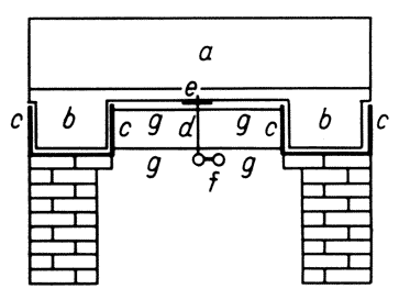 Шпилька d, направляемая рычагами gggg, совпадает с гнездом е, проделанным в поплавке. Посредством ручки, надетой в f, она может либо вставляться в гнездо, либо выниматься из него. Эта шпилька делает поплавок соосным с лотком, но не несет ни малейшей части веса камня. Кольцеобразный чугунный лоток опирается на цементную подложку, лежащую на низком кирпичном основании, выложенном в форме полого восьмиугольника.