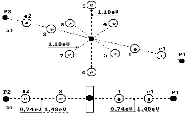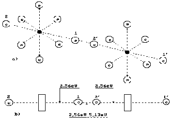 Два атома кислорода соединяются в молекулу в состоянии возбуждения. Состоянием возбуждения считается такое состояние атома, при котором его валентные электроны удалены от ядер на такие расстояния, когда энергия связи между ними уменьшается до тысячных долей электрон-вольта. В таком состоянии атом может потерять электрон и стать ионом. Или, не теряя электроны, он соединяется валентным электроном с электроном соседнего атома и начинается процесс формирования молекулы кислорода. Это – экзотермический процесс, при котором осевые валентные электроны 1 и 2', излучая фотоны и опускаясь на более низкие энергетические уровни, выделяют 2,565×2=5,13эВ. Обратим внимание на то, что энергия 5,13эВ выделяется двумя электронами, формирующими связь с энергией 2,56эВ. В современной химии эта связь называется ковалентной. Для разрушения этой связи достаточно затратить 2,56эВ механической энергии. Для термического разрыва этой связи энергии требуется в два раза больше, то есть 5,13эВ. Это объясняется тем, что энергия фотона 5,13эВ поглощается одновременно двумя электронами. Только в этом случае оба электрона будут переведены на самые высокие энергетические уровни с минимальной энергией связи, при которой они разъединяются, и каждый атом кислорода становится свободным.