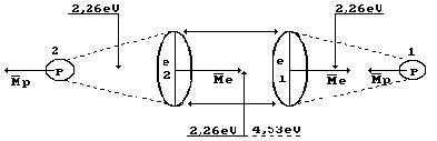 Энергия синтеза молекулы водорода равна 436кДж/моль или 4,53эВ на одну молекулу. Поскольку молекула состоит из двух атомов, то указанная энергия распределяется между ними. Таким образом, энергия одной связи между атомами водорода оказывается равной 2,26эВ (рис.4). При механическом разрыве этой достаточно затратить 2,26эВ. При термическом разрушении этой связи энергии потребуется в два раза больше (2,26×2=4,53эВ).