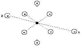 На рис.2 представлена схема атома кислорода, следующая из структуры его ядра (рис.1). Он имеет восемь электронов, наиболее активны те из них (1, 2), что расположены на оси симметрии. Шесть других электронов, расположенных в плоскости перпендикулярной осевой линии (линии симметрии), своим суммарным электрическим полем удаляют электроны 1 и 2 от ядра на большее расстояние, формируя условия для большей их активности при взаимодействии с электронами соседних атомов [1].