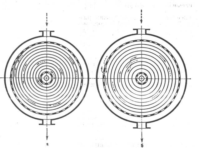 На рис. 18,а изображен горизонтальный ротационный аппарат со спирально свернутым ротором, а на рис. 2,б аппарат с цилиндрическим ротором. Направление движения газа показано штриховыми линиями, направление течения жидкости – сплошными. Подвод жидкости и отвод газа осуществляются через полый вал. Скорость газа в таких аппаратах при противоточном движении фаз может достигать 30 м/с и более без наступления захлебывания. Испытания по ректификации различных смесей в аппаратах обоих типов показали большую эффективность аппарата с цилиндрическим ротором.