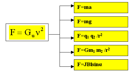 Это взаимодействие лежит в основе четырех известных взаимодействий. Из этой формулы непосредственно следуют: формула Кулона, формулы Ньютона, в том числе формула для гравитационной силы, формула Ампера для проводников с током [5, 8, 9, 10]. Предельное значение силы, которое следует из этого закона, становится равным кулоновской силе взаимодействия единичных зарядов. На (рис. 4) показана связь формулы F = Gu·ν2 с формулами известных законов физики.