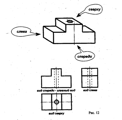 В черчении изображение обращённой к наблюдателю видимой части поверхности предмета называется видом. Названия видов зависят от того, с какой стороны рассматривают предмет при проецировании (рис. 12).