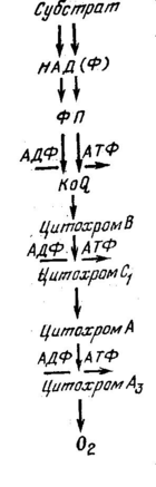 Процесс окисления субстрата в дыхательной цепи сопровождается фосфорилированием АДФ и запасанием энергии в форме АТФ. В цепи окисления есть три участка фосфорилирования: участок окисления флавопротеидов, участок перехода электронов от цитохрома В к цитохрому С и участок перехода электронов от цитохрома А к цитохрому Аз (рис. 1).
