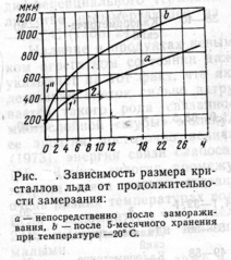 На опыте хорошо видно, как разница в числе и размерах кристалликов льда у быстро и медленно замороженных продуктов постепенно исчезает при хранении.