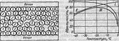 Рис. 92. Влияние температуры на обратимость замерзания. Кривая / показывает, что уменьшение температуры и увеличение скорости замерзания благоприятно действуют на обратимость, а кривая // показывает, что снижение температуры вследствие концентрации клеточной влаги действует на обратимость неблагоприятным образом. Характеризующая суммарное воздействие этих процессов кривая /// получается суперпозицией кривых / и //.