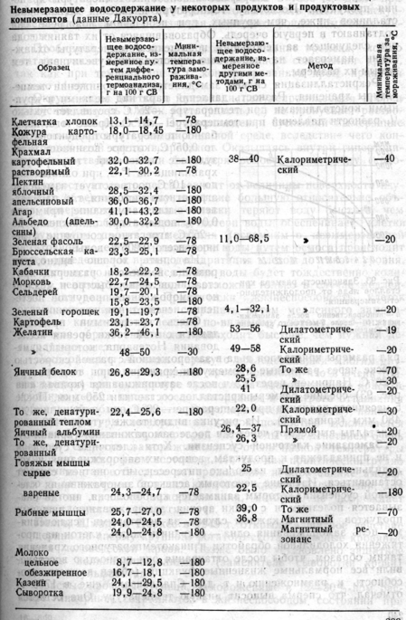 10)Количество вымерзающей воды. Вымерзание воды из растительных и животных клеток начинается при температуре их замерзания. По мере отбора тепла вымерзает все больше воды, а концентрация растворенных в клеточной влаге веществ увеличивается. После достижения определенной точки снижать температуру далее бесполезно, поскольку вода из клеток больше не вымерзает. Некоторое ее количество даже при очень низких температурах остается в жидкой фазе. С помощью современного дифференциального термоанализа Дакуорт (1971) установил количество невымерзающей из продуктов воды при температуре —180° С (табл. ).