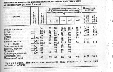 Видно, что при температурах ниже точки замерзания продолжительность хранения увеличивается быстрее при уменьшении температуры, чем в температурной области выше точки замерзания. Таким образом, после перехода через точку замерзания не только уменьшается скорость биохимических реакций, но вступает в силу и новый фактор, влияющий на удлинение срока сохраняемости продуктов. Таким фактором является вымерзание находящейся в продуктах воды (табл. ).