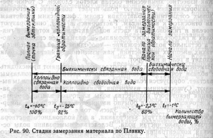 Уменьшение обратимости коллоидов по мере вымерзания воды ведет к уплотнению остаточного раствора. Водные растворы, образующие клеточную влагу, в зависимости от вида продуктов со-
