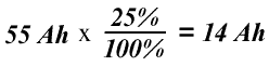 Для примера определим время зарядки батареи емкостью 55 Ач током в 5А, плотность которой составляет 1.25 г/см3. Как видно из графика, при данной плотности батарея разряжена на 25%, что означает потерю емкости на величину