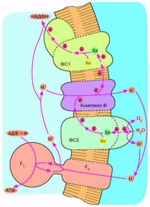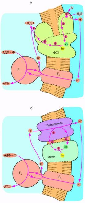 Рис. 5. Хлорофиллычый фотосинтез зеленых серных (а) и пурпурных (б) бактерий: а - хлорофилл, связанный с особым белковым комплексом - фотосистемой 1 (ФС1), возбуждается квантом света и отдает электрон по цепи электронных переносчиков на НАД*. Восстанавливаясь, НАД* связывает внутриклеточный ион Н*. Потеря электрона на хлорофилле компенсируется окислением сероводорода до серы и иона Н* снаружи бактериальной клетки. Движение Н* внутрь клетки через комплекс F0 F, дает АТФ; б - хлорофилл, связанный с белком фотосистемы 2 (ФС2), поглощает квант света и запускает циклический перенос электронов. В этом процессе участвуют переносчики электронов ФС2 и дополнительного белкового комплекса III. Перенос электронов комплексом III сопряжен с откачкой ионов Н* из клетки. Откачанные ионы Н* возвращаются через комплекс F0 F, с образованием АТФ.