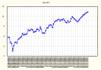 На рис.11 построена модель АРПСС с параметрами p=1, d=1, q=2. Среднеквадратичная ошибка равна 1,6853. прогноз на 26.12.2001 равен 99,429.