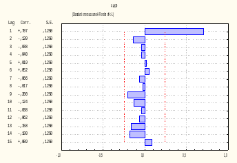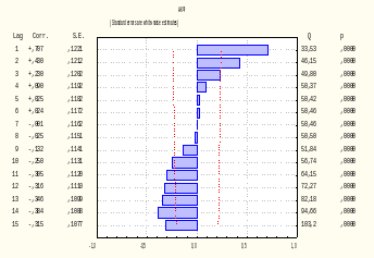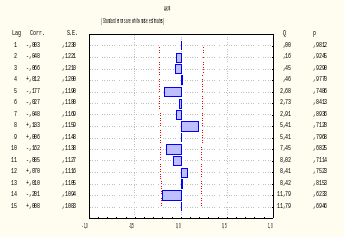 Б.) Моделирование с помощью АРПСС производится на исходном ряде. Перво-наперво нужно определить порядки p, d и q. На практике это делается на основе разностей только первого или второго порядков. Термин «проинтегрированный» означает, какого порядка нужно взять разность, чтобы получить ССП. Тогда порядком разности и будет d. p и q определяются с помощью коррелограмм ЧАКФ (рис.10) и АКФ (рис.9) ССП, полученного разностями.