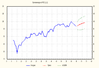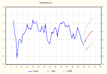 На рис.7 смоделирован ССП методом АРСС с параметрами p=2, q=1 и среднеквадратичной ошибкой 1,5822. Дальнейшее преобразование в прогноз временного ряда осуществляется сложением тренда и смоделированного ССП (рис.8).