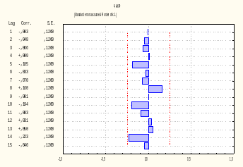 На рис.5 показана коррелограмма АКФ, на рис.6 – ЧАКФ. С помощью этих коррелограмм и эмпирического поиска наименьшей среднеквадратичной ошибки мы определяем неизвестные параметры: p=2, q=1.