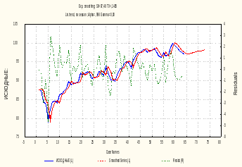 На рис.14 построена адаптивная модель Хольта нашего исходного ряда. Параметры адаптации следующие: Альфа=0,998, Гамма=0. Среднеквадратичная ошибка равна 1,6469. Прогноз на 26.12.2001 составляет 98,251. По спектру ряда остатков (рис.15) видно, что эта модель является неадекватной.