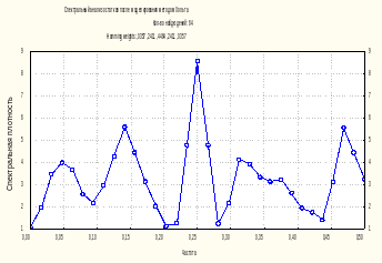 Спектр ряда, оставшегося после моделирования АРСС (рис.12) далеко не похож на спектр «белого шума». Это говорит о том, что эта модель не является адекватной.