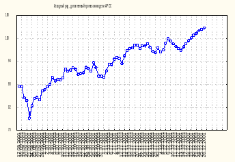 Адаптивная модель Хольта содержит чуть меньшую среднеквадратичную ошибку, чем АРПСС, но график ее прогноза, во всяком случае, не лучше совпадает с общей динамикой, показывая менее крутой подъем индекса, чем на протяжении всего ряда.