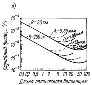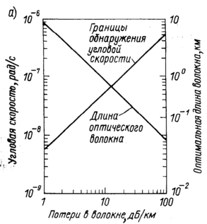 Результаты расчета при типичных значениях параметров приведены на рис. 5, а. Для оптического волокна с потерями 2 дБ/км пределы обнаружения примерно 10-8 рад/с (0,001/ч). Это как раз значения, применяемые в инерциальной навигации. На рис. 5, б показано, что благодаря увеличению радиуса катушки с оптическим волокном, а также использованию света с длиной волны 1,55 мкм, на которой потери в оптическом волокне очень низки, возможно создание измерителя оборотов в инерциальном пространстве с чрезвычайно малым дрейфом. Это позволяет применять измеритель не только в навигации, но и в геофизике.