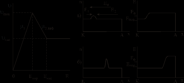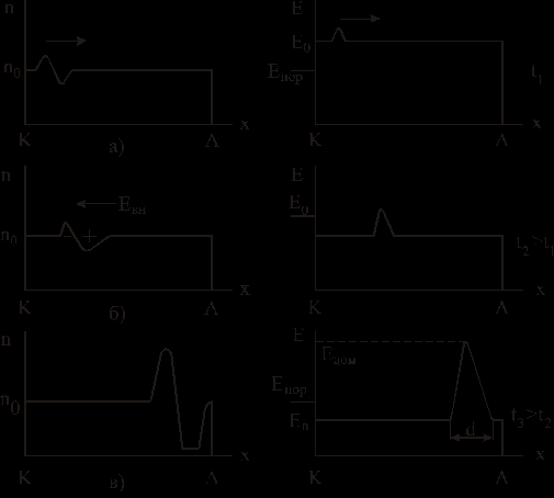, увеличивая напряженность поля справа от слоя и уменьшая ее слева (рис.2, а). Скорость электронов справа от слоя уменьшается, а слева – возрастает. Это приводит к дальнейшему нарастанию движущегося слоя накопления и к соответствующему перераспределению поля в образце (рис.2, б). Обычно слой объемного заряда зарождается у катода, так как вблизи катодного омического контакта имеется область с повышенной концентрацией электронов и малой напряженностью электрического поля. Флюктуации, возникающие вблизи анодного контакта, вследствие движения электронов к аноду не успевают развиться.