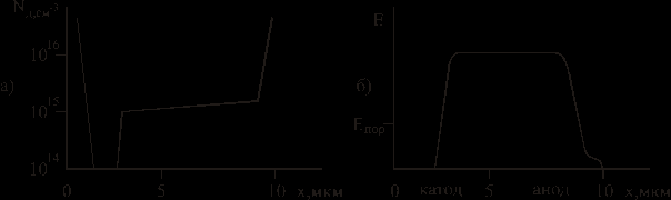 ис.12. Профиль легирования (а) и распределение поля (б) в диоде Ганна с высокоомной прикатодной областью.