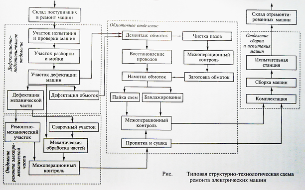 Все работы, проводимые в этом цехе, можно разбить на восемь основных видов: предремонтные, разборочно-дефектационные, изоляционно-обмоточные, слесарно-механические, комплектовочные, сборочные, отделочные и послеремонтные. В соответствии с видом производимых работ в состав ремонтного цеха, как правило, входят следующие отделения и участки: