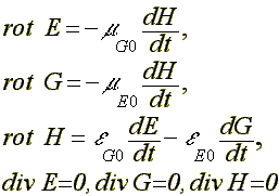 где E, H, G – напряженность электрического, магнитного и гравитационного поля; μG0 , μE0 магнитная постоянная гравитационного и электрического подпространства-времени; εG0 , εE0 – электрическая постоянная гравитационного и электрического поля-эфира.