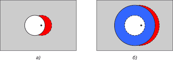 В действительности асимметрично расположенная масса имеет форму тела, выделенного красным цветом на рис. 10б. Но гораздо удобнее вычислять действие массы, имеющей форму шара (выделен на рис. 10а синим цветом), благо притяжение ими пробной массы тождественно равно. Направление действия силы во всех случаях определяется положением центра масс избыточного вещества, выделенного красным цветом.