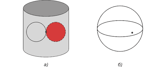 Усомнившемуся читателю приведем наглядный пример. Взгляните на рис. 12а, на котором изображен цилиндр с отверстием в боковой стенке. По нашему замыслу цилиндр отождествляет бесконечное двухмерное пространство с полостью (красным цветом выделена асимметрично распложенная масса).