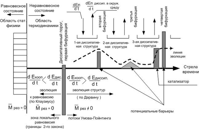 Всесилие механизма рассеяния, приводящего систему к равновесию, заключается в том, что материя имеет корпускулярное строение, т.е. частицы имеют конечные размеры, а значит соударение нецентральное. Частиц же великое множество и затухание происходит очень быстро. Именно благодаря этому простому, но всесильному механизму обратимые законы механики в приложении к многомолекулярным системам, вырождаются в необратимые законы статистики. Ведь для обращения процесса рассеяния назад необходимо, чтобы в один и тот же момент все частицы системы, вовлеченные так или иначе в процесс рассеяния, столкнулись по закону центрального абсолютно-упругого удара с каким-то препятствием, чтобы отлететь с той же скоростью в строго обратном направлении. Это невозможно в принципе. Во - первых в реальности не возможен абсолютно-упругий удар. Во - вторых как в многомолекулярной системе вообще организовать внедрение этих очень массивных, теоретически с бесконечной массой, препятствий? Причём бесконечные массы перед каждой из частиц нужно внедрить мгновенно, в один момент, и при этом обеспечить строго центральное соударение, чтобы все частицы одновременно повернуть назад. Как это сделать, учитывая порядок числа Лошмидта и то, что реальные частицы не шары? Сказанное и является основой необратимости процесса вырождения импульса в термодинамических системах. Релаксация и необратимость вытекают из обратимых законов механики при их действии в среде многомолекулярных систем. Обратим особое внимание на это свойство диссипативных сред, их способность качественно вырождать закон сохранения результирующего импульса и как следствие качественно изменять динамику, когда детерминизм динамики уступает место вероятности статистической механики. Это происходит в результате действия эффекта вырождения результирующего импульса, который является стержневым свойством многочастичных (диссипативных) сред. Именно принципиальная необратимость эффекта вырождения результирующего импульса в многочастичных системах приводит к необратимости макроскопических процессов, следствием чего является необратимая последовательность событий, наличие стрелы времени. Принципиальная схема эволюции, приводящая к понятию стрелы времени, изображена на рисунке 2.