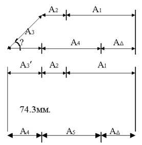 Рис.3.2Схема плоской параллельной размерной цепи. А3= А3*Cos = 100 * Cos42 = 74.3мм.