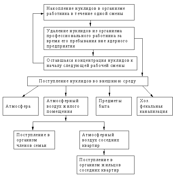Профессиональный работник большую часть времени находится в жилой квартире и некоторое время - в местах общественного пользования. Поэтому удаляемые нуклиды из его организма будут переходить через атмосферный воздух и водные среды и далее в организм членов его семьи, предметы быта и т.д..