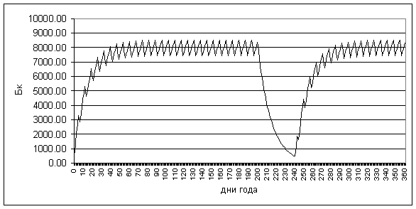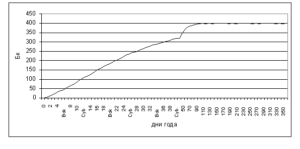 Рис.2. Накопление трития в организме работника с учётом очередного отпуска продолжительностью 40 дней.