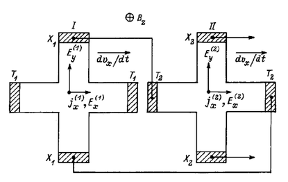 Итак, в магнитном поле Bz (направление которого на рисунке обозначено знаком ) в первом холловском элементе (I) возбуждается ток j(1)x , поле E(1)x и холловское поле E(1)y, даваемые выражениями (1)–(3). Замкнув потенциальные (холловские) контакты X1-X1 на токовые контакты T2-T2 холловского элемента II, в последнем дополнительно к первичному полю E(2)x = E(1)x, определяемому выражением (2), имеем и поле E(1)y. Так что результирующее поле имеет два компонента — E(2)x = E(1)x+ E(1)y. Это возможно, если холловский элемент I рассматривать как генератор напряжения, нагруженный на холловский элемент II. В этом случае должен выполняться режим ”холостого хода”, для чего необходимо выполнить условие R(X1-X1)<<R(T2-T2), где R — сопротивление между соответствующими контактами. В таком случае в холловском элементе II возбуждается поле