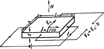 ффектом Холла называется появление в проводнике с током плотностью j, помещённом в магнитное поле Н, электрического поля Ех, перпендикулярного Н и j. При этом напряжённость электрического поля, называемого ещё полем Холла, равна: