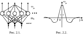 Структура нейронной сети, в которой реализуется формирование карт признаков, приведена на рис. 2.1. Нейроны, имеющие сигмоидную характеристику, расположены в виде одно- и двумерного слоя слоя по аналогии со слоистым строением коры. На каждый нейрон поступают два вида связей: mij, которые интерпретируются как связи от сенсорных входов или из других областей, и jk - латеральные связи от нейронов одного слоя, характер которых зависит от расстояния между нейронами. Функция взаимодействия нейронов одного слоя имеет вид “мексиканской шляпы” (рис. 2.2.), что соответствует некоторым нейробиологическим данным. Близко расположенные нейроны возбуждают друг друга, с увеличением расстояния возбуждение сменяется торможением, а затем опять появляются слабые возбуждающие связи, которые по-видимому, выполняют ассоциативные функции и в данной модели не используются.